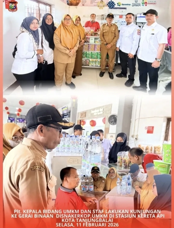 Plt. Kabid UMKM dan staf melakukan kunjungan ke Gerai Binaan Dinas Ketenagakerjaan, Koperasi, Usaha Mikro Kecil dan Menengah di Stasiun Kereta Api Kota Tanjungbalai pada Selasa, 10 Februari 2026